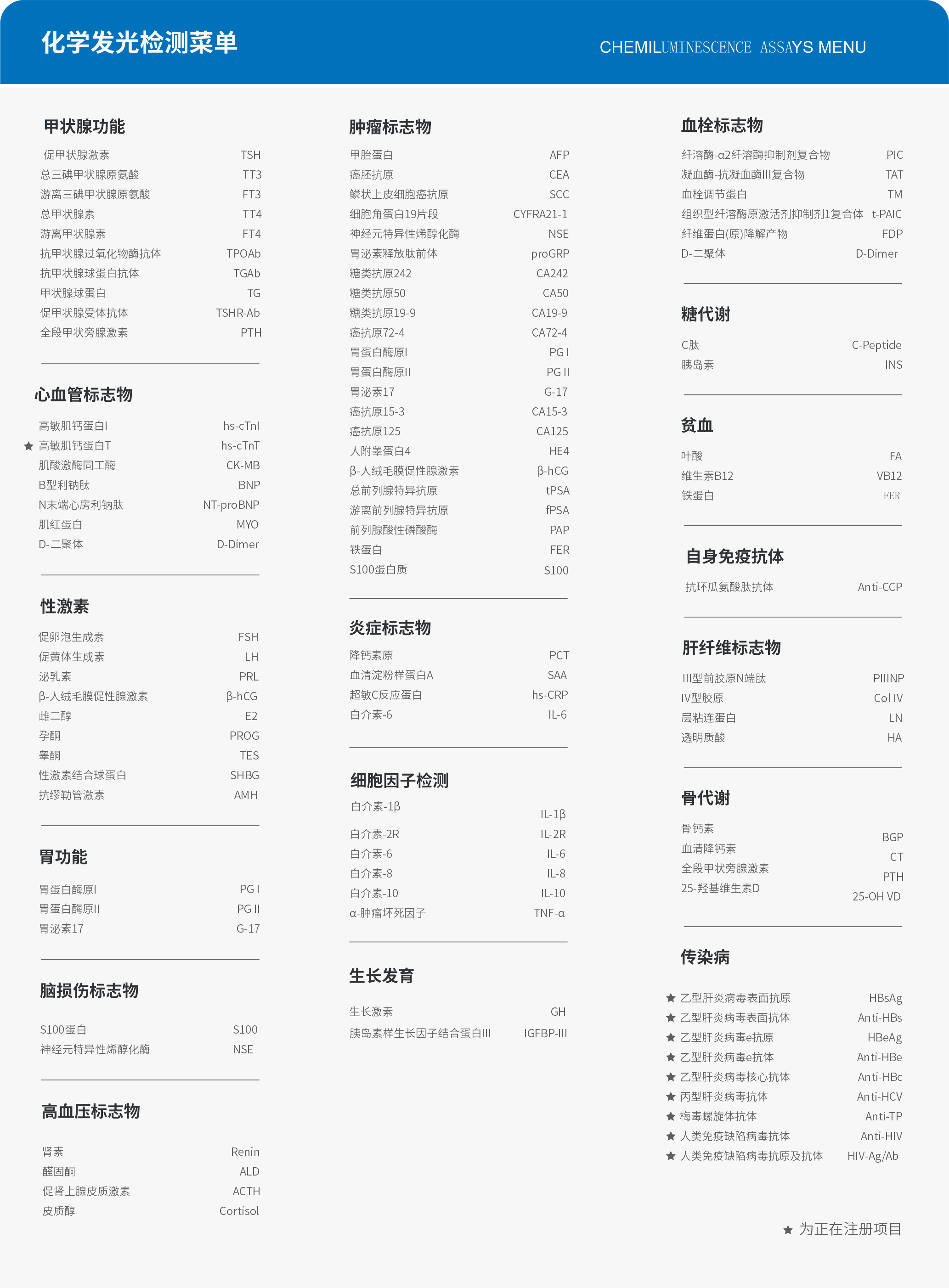 化學發光檢測試劑菜單